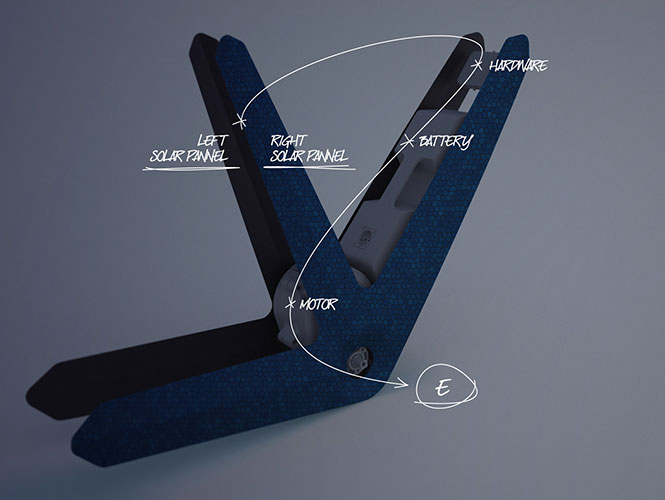 The collected solar power allows for the vehicle to travel around 20 km per day. If more energy needed, the battery can be connected to a conventional power source. The bike has an indicator showing the battery status and remaining power.